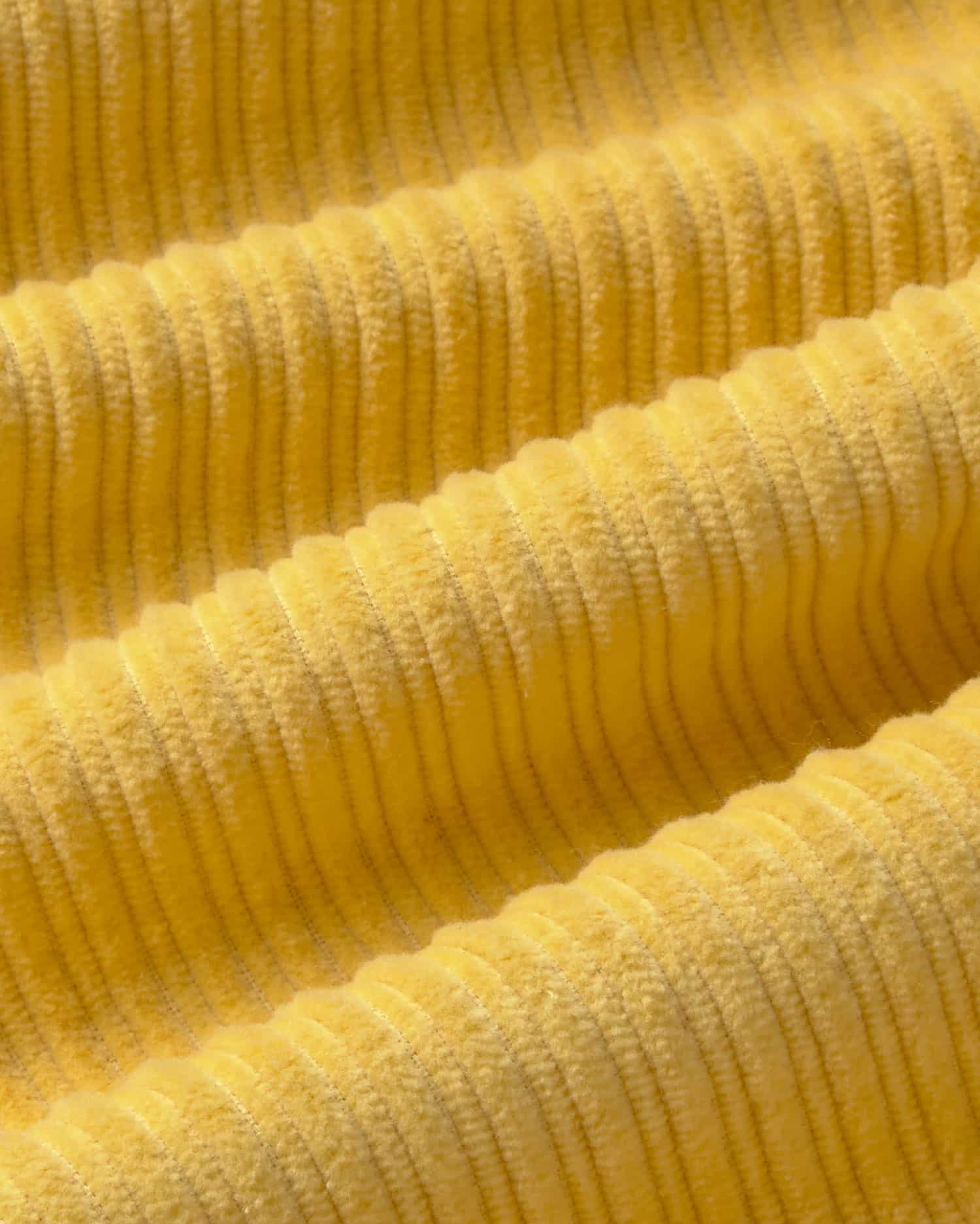 Une matière hivernale : le velours côtelé, marié ici avec une couleur d'été : le jaune soleil. Le résultat est ce pantalon aux jambes larges vitaminé, qui transformera n'importe quelle journée en petite fête.