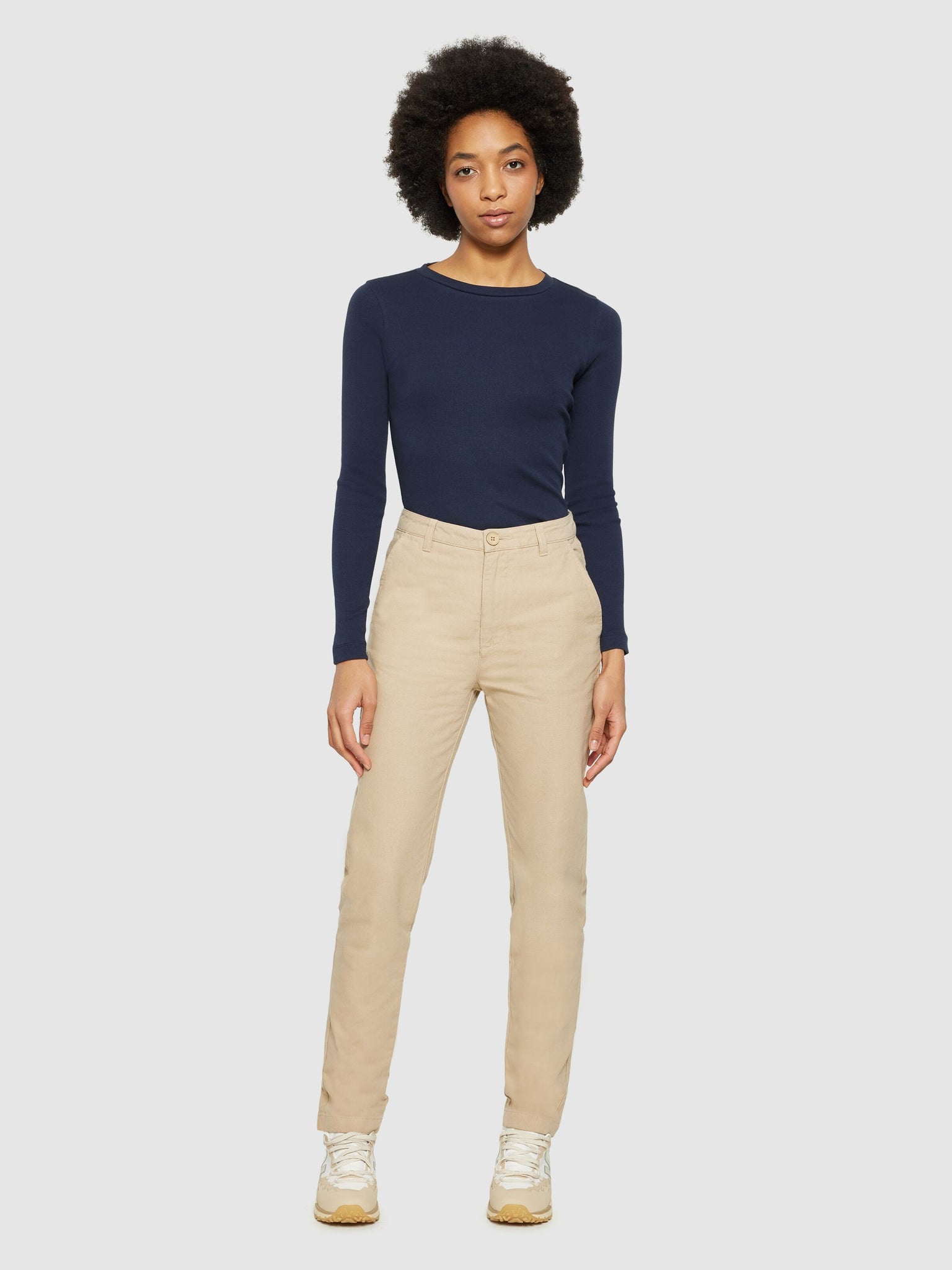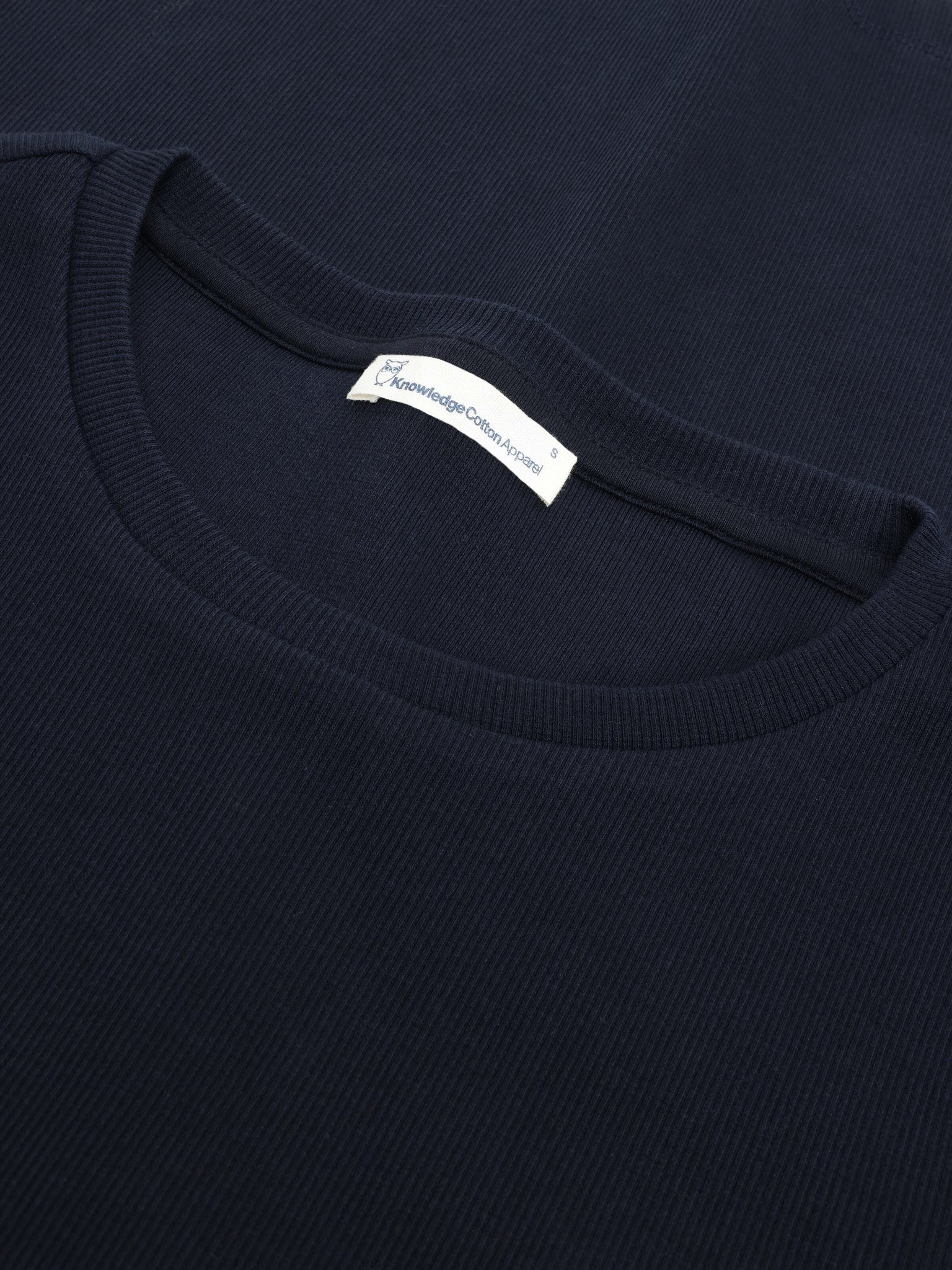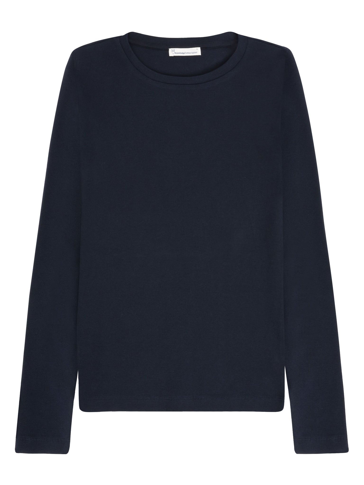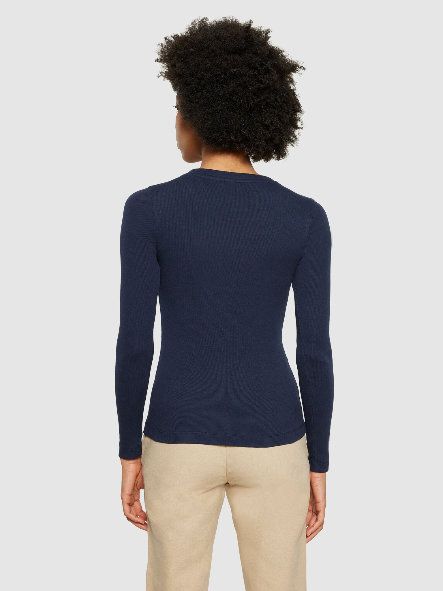 Le basique indispensable pour les saisons froides, c'est ce t-shirt à manches longues près du corps, dans un bleu nuit délicat. Il épouse parfaitement notre buste pour nous garder au chaud.