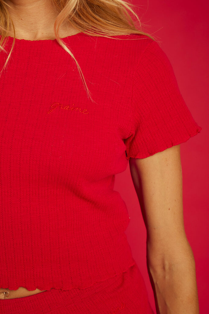 Vous avez dit "petit t-shirt rouge"? Car on en a trouvé un. Court et près du corps, c'est le genre d'essentiel qui ne va plus vous quitter. Matière texturée et bords froufroutés viennent compléter ce sublime tableau.