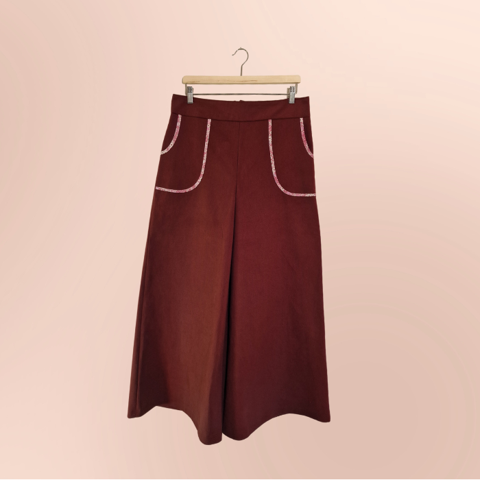 Il se décline de trois manières : en velours agrémenté d'un biais rose - taille 38, en gabardine agrémenté d'un biais fleuri - taille 42, et en bi-matière (velours/gabardine), agrémenté d'un biais vert - taille 40.