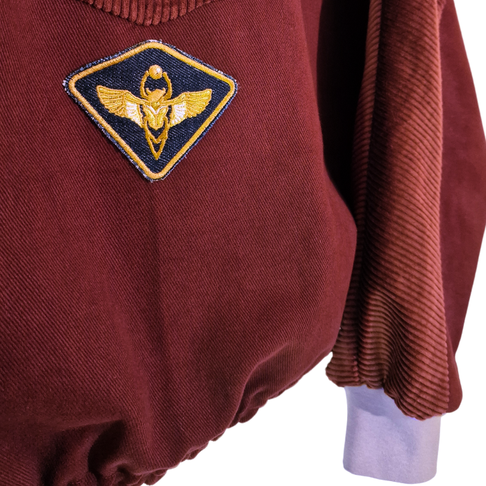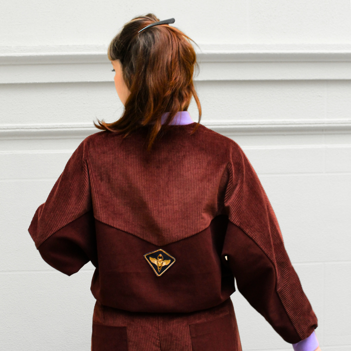 Elle est finie par des bord-côtes colorés et l'écusson du collectif qui souligne la forme triangulaire de la coupe au dos.