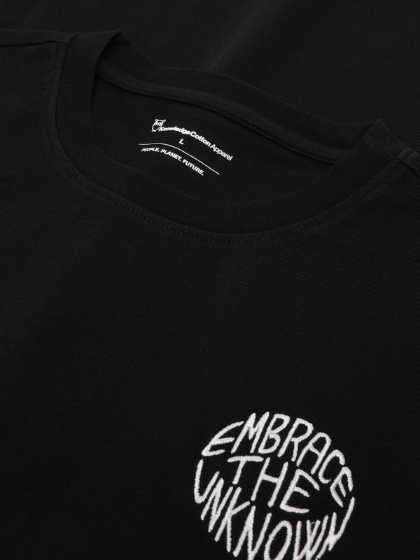 Un t-shirt en coton épais, noir pour aller avec tout, simplement rehaussé de la broderie "Embrace the Unknown" sur la poitrine. Accueillez l'inconnu, oui ! Mais pour vos vêtements, faites-confiance à WeCo Store et à ses matières naturelles respectueuses de l'environnement.