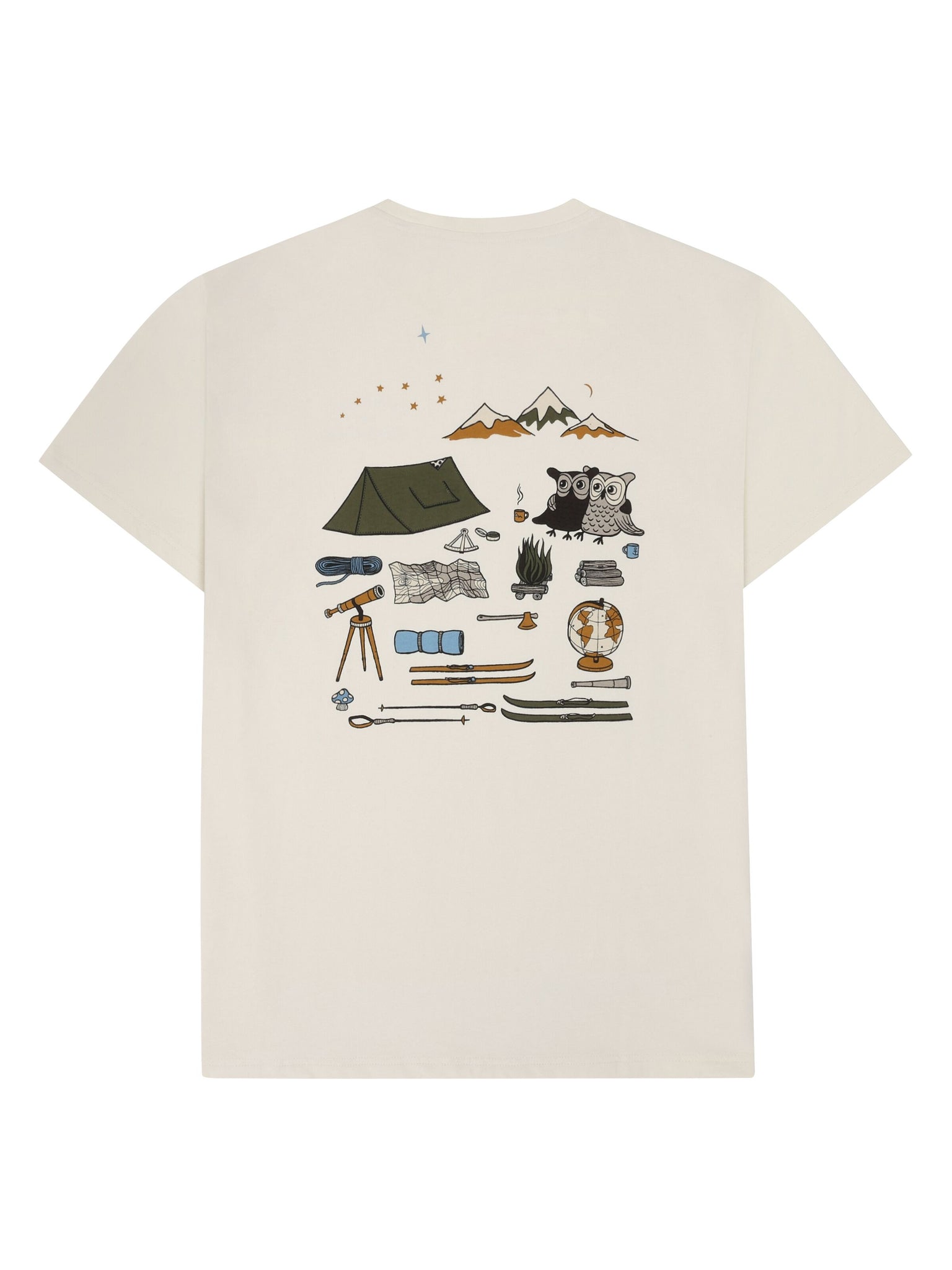 Les illustrations sur les t-shirts, c'est encore mieux au dos! On croit que vous portez un t-shirt ordinaire, vous vous retournez et là paf, surprise : un design qui claque. Ici, de jolis dessins de camping, une envie d'évasion...